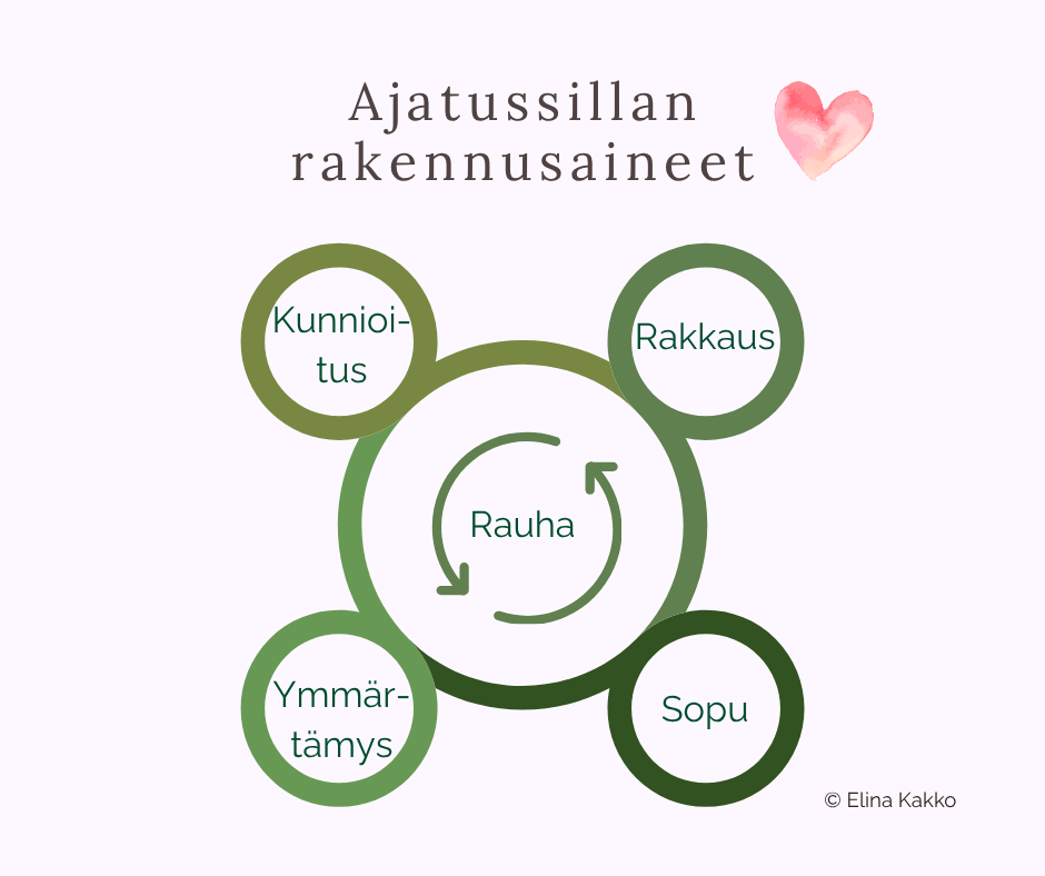 Alla olevassa kuvassa näkyvät ajatussillan viisi rakennusainetta – ne ovat jokaisen ihmissuhteen sydänenergiaa.