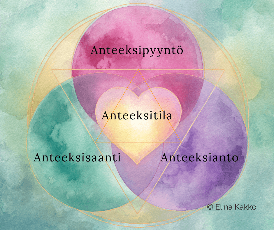Anteeksitilan mandala. Anteeksitila pitää sisällään anteeksiannon, anteeksipyynnön ja anteeksisaannin.